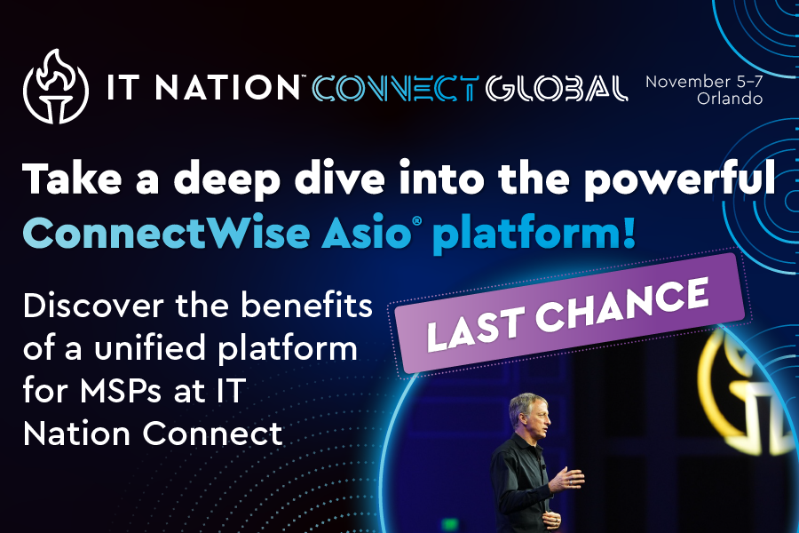 IT Nation Connect is already 50% sold out! Don’t miss your chance to explore the ConnectWise Asio® platform and discover how a unified solution can transform your MSP. Join us in Orlando, November 5–7—register before it’s too late!