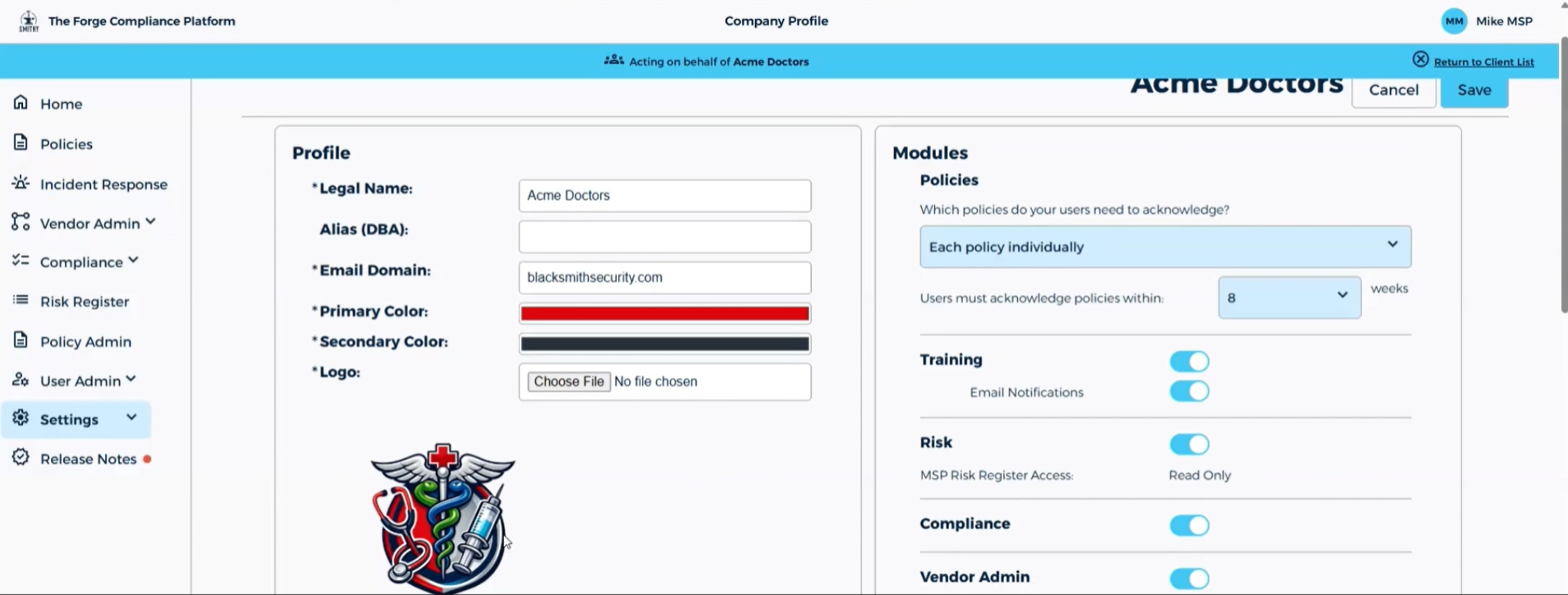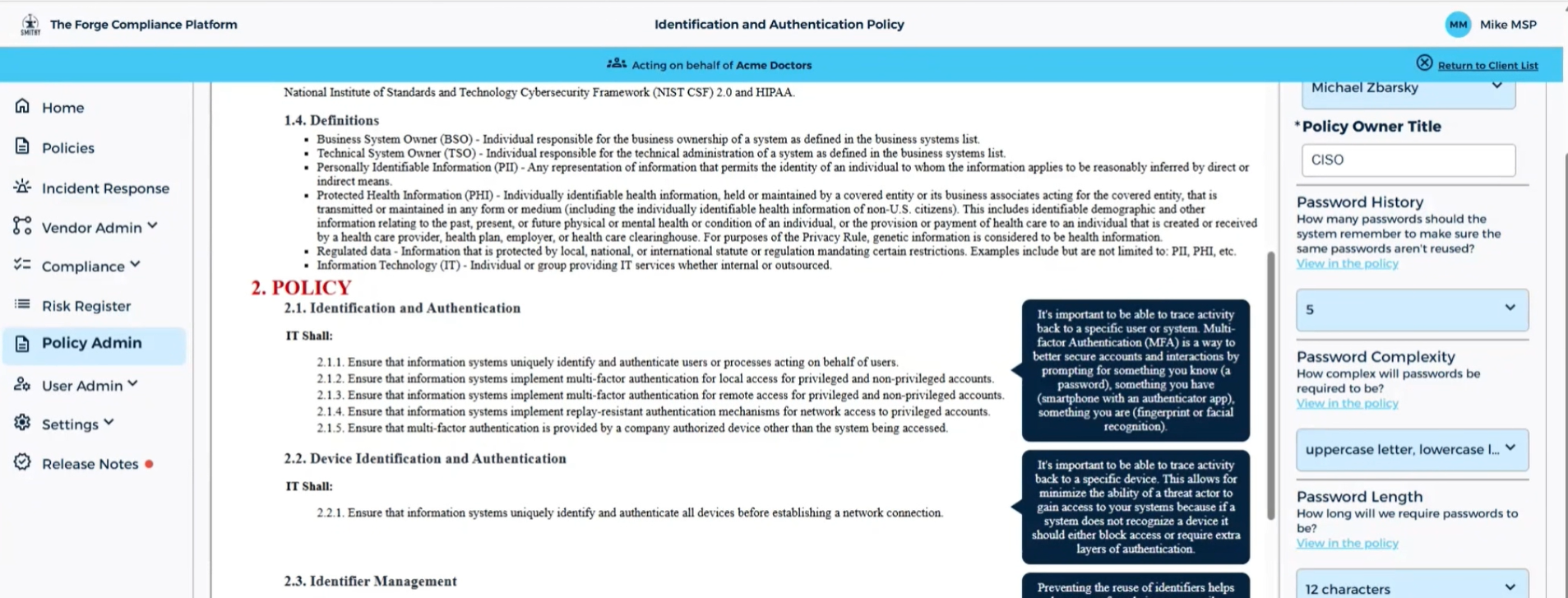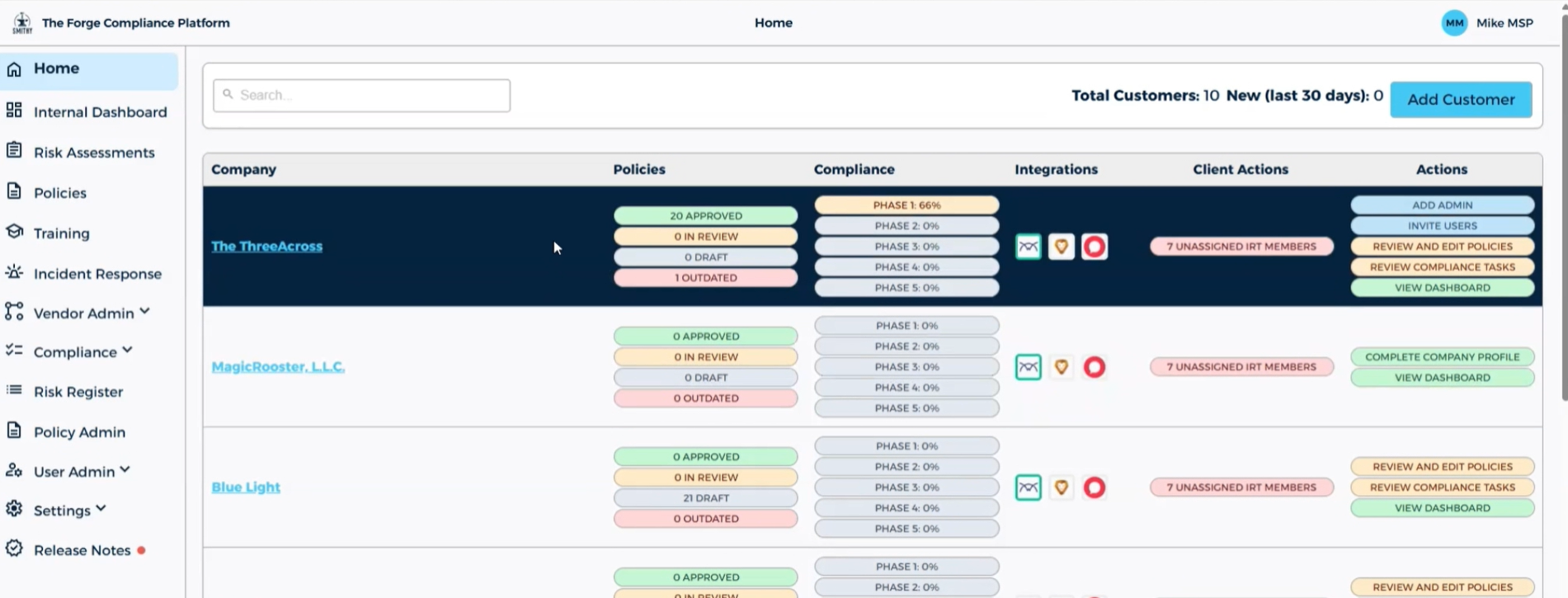 Set yourself apart from other MSPs with an all-in-one, multi-tenanted Compliance-as-a-Service platform to craft and manage security programs for your clients. The Blacksmith platform allows you to custom brand the portal for your clients. We offer security policy templates aligned to the major regulatory and compliance frameworks. As policies are rolled out, each client gets a personalized compliance roadmap. With built-in tools like a risk register, security awareness training, incident response plans, user audits, and much more, the Blacksmith platform offers a complete security program, uniquely tailored to each client. Now you can deliver compliance services at scale.