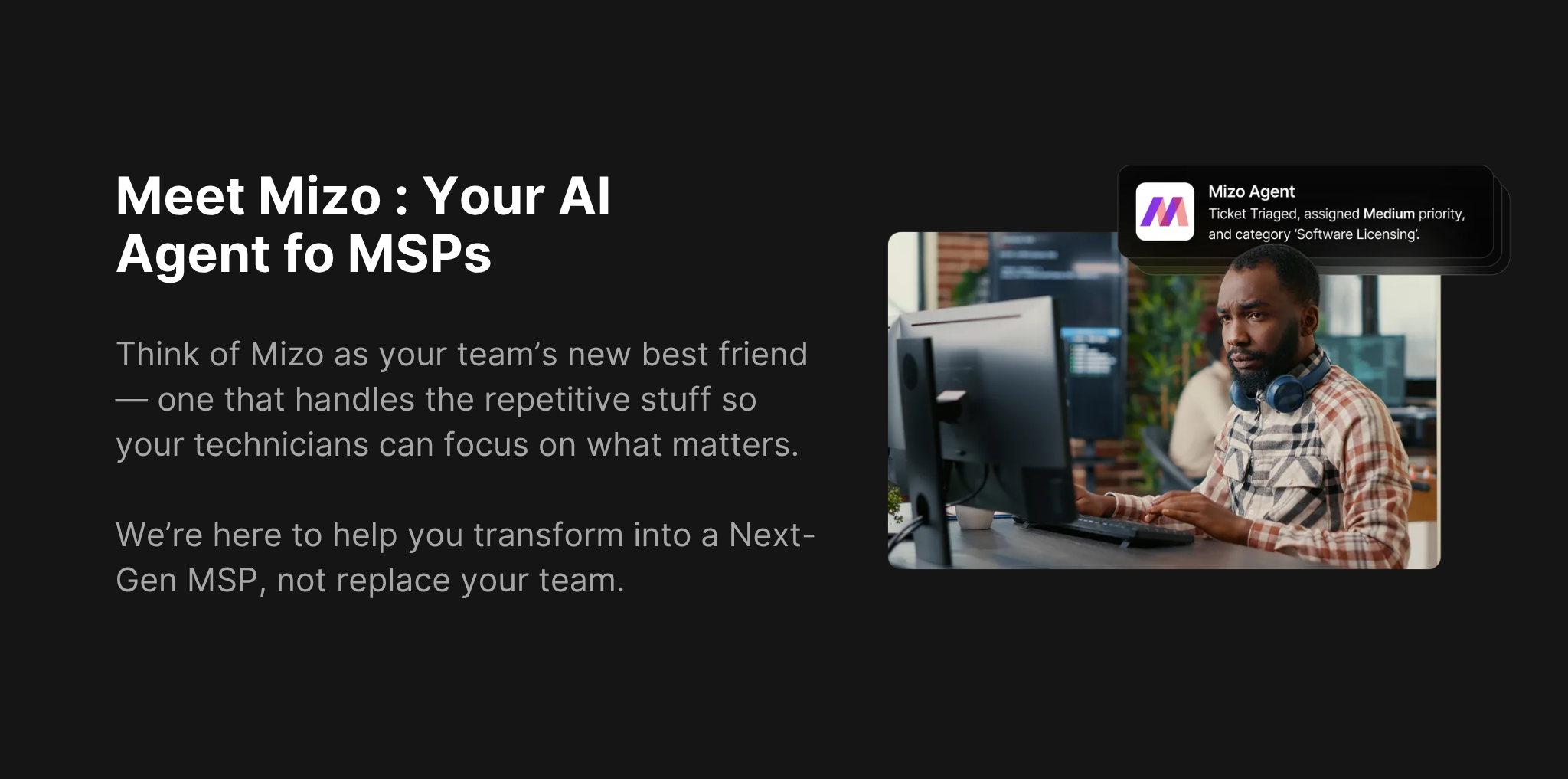 Transform your MSP service desk with intelligent AI agent-based automation. Handle ticket triage, dispatch, resolution, documentation, and knowledge base updates. Improve engineer productivity and customer satisfaction with Mizo, the AI agent for MSPs.