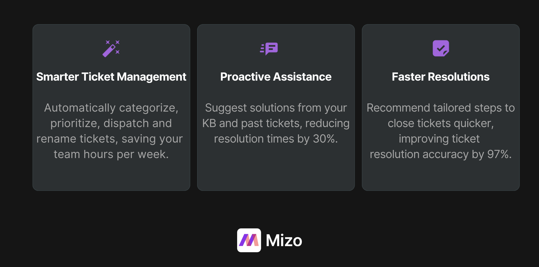 Built by an MSP for MSPs, Mizo leverages historical data, ticketing patterns, and documentation from external sources like Hudu, ITGlue, SharePoint, and more. It continuously learns and improves, helping your team handle tickets faster and more accurately.
