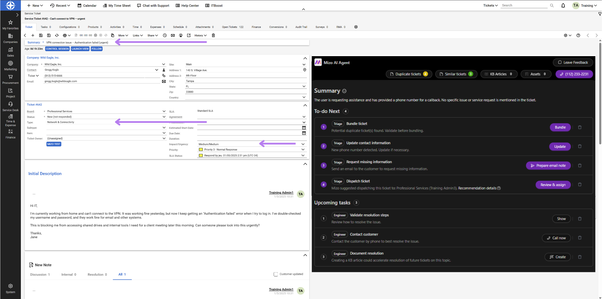Mizo is an AI-powered agent designed to enhance every level of support for Managed Service Providers using ConnectWise. Whether it’s Level 1, 2, or 3, Mizo helps accelerate ticket resolution by automating triage and dispacth, suggesting accurate responses, and surfacing relevant knowledge, all within your existing ConnectWise environment.